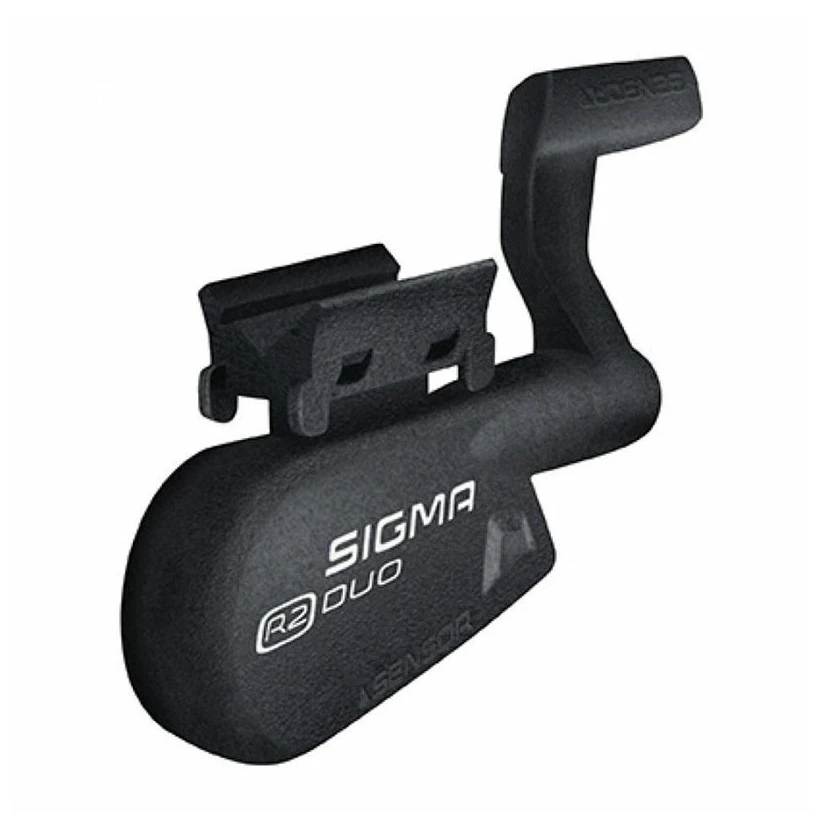 Trasmettitore wireless Sigma R2 DUO con magneti di potenza e asse del pedale. R2 DUO è un trasmettitore di velocità e frequenza di pedalata e utilizza due diverse tecnologie di trasmissione.