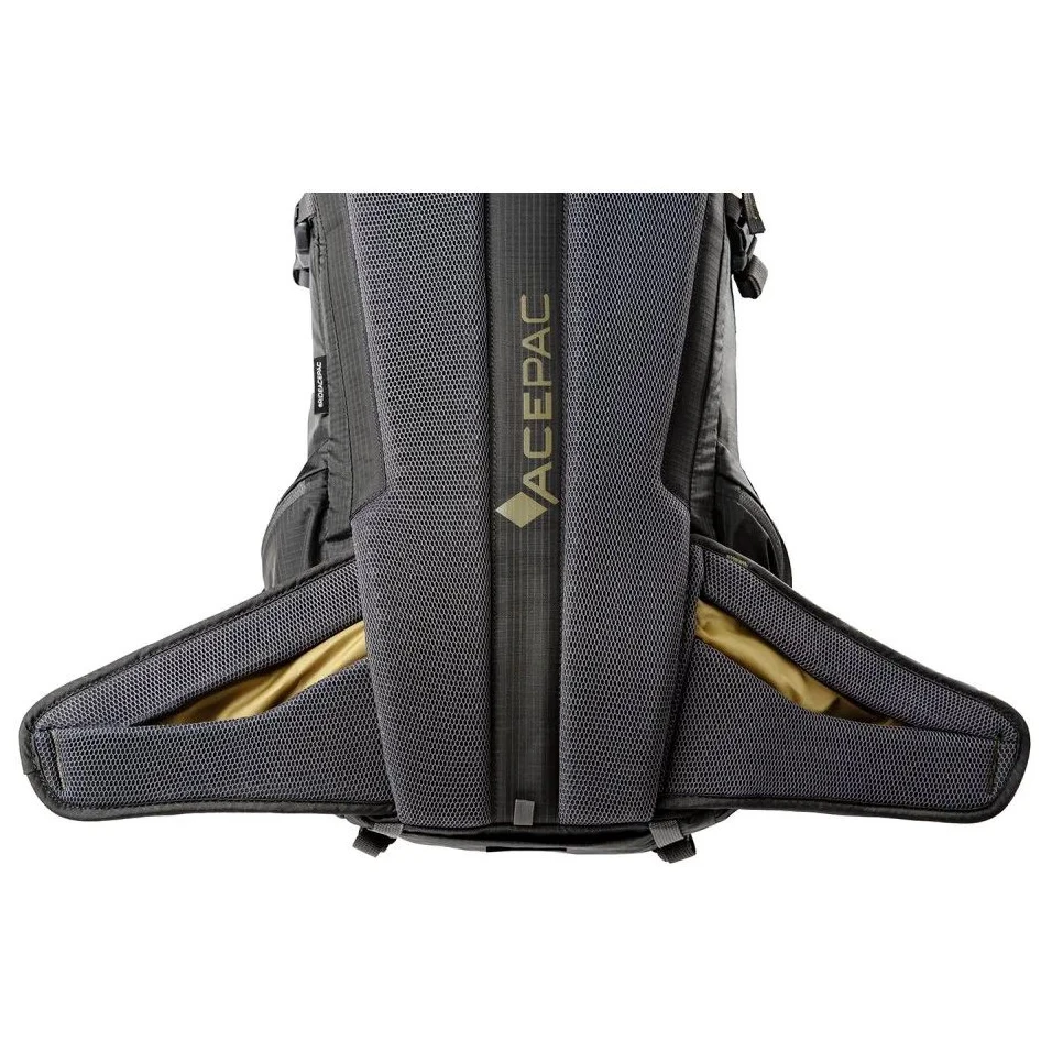Lo zaino Flite 10 MKIII dell'azienda Acepac è dotato di tasche sulla cintura per i piccoli oggetti che si desidera estrarre immediatamente mentre si cammina o si va in bicicletta. Nel vano principale dello zaino è presente una tasca destinata principalmente alla protezione della colonna vertebrale, ma può essere utilizzata anche come spazio aggiuntivo. Lo zaino è dotato di un sistema di cinghie Carry on compatibile con le borse Acepac Bar Bag o Bar Drybag 8 L, che possono essere facilmente agganciate allo zaino.
