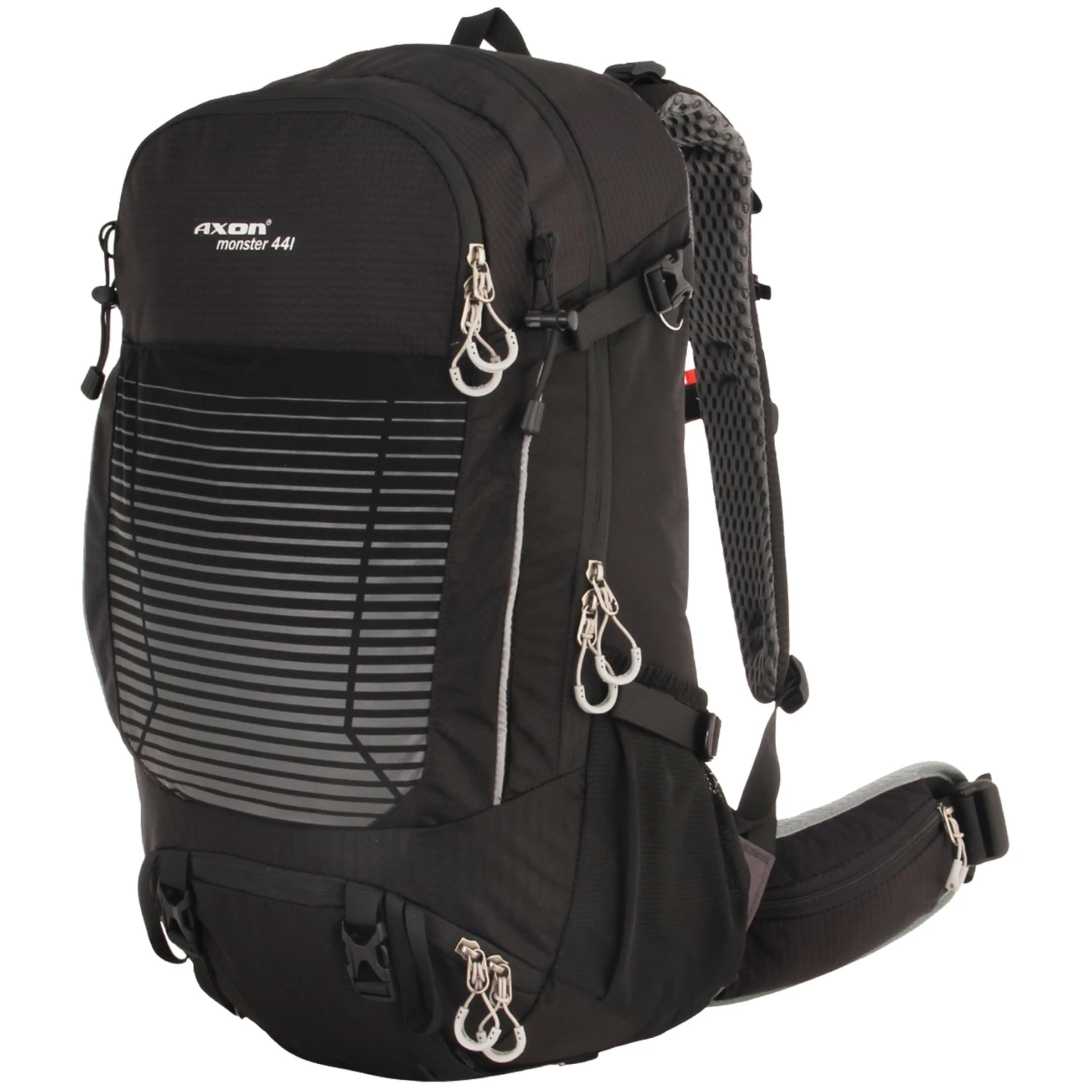 Lo zaino Axon Monster è uno zaino universalmente utilizzabile per escursioni turistiche impegnative di uno o più giorni. Ha uno schienale imbottito e ventilato Airconntact con cintura lombare imbottita con tasche con zip.