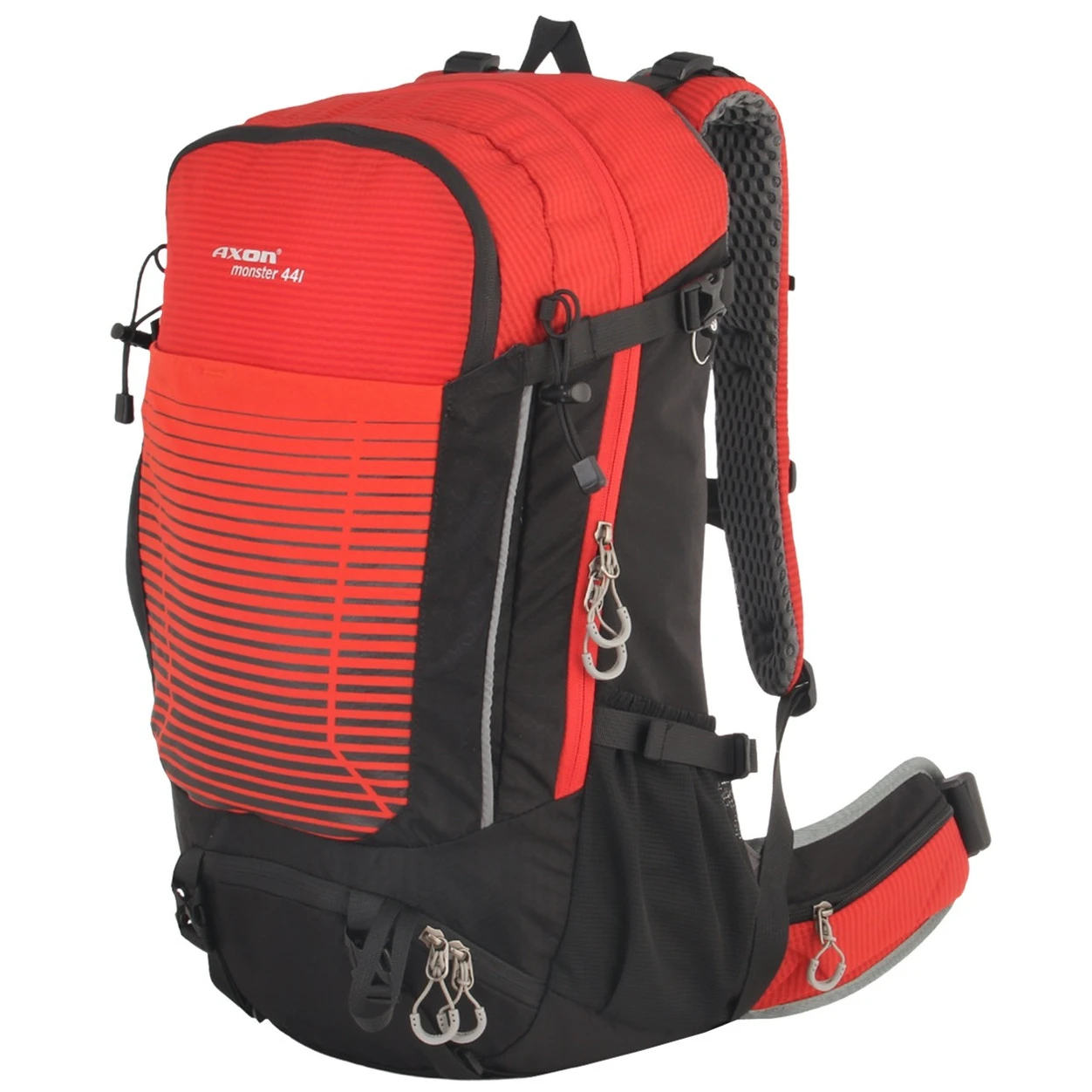 Lo zaino Axon Monster è uno zaino universalmente utilizzabile per escursioni turistiche impegnative di uno o più giorni. Ha uno schienale imbottito e ventilato Airconntact con cintura lombare imbottita con tasche con zip.