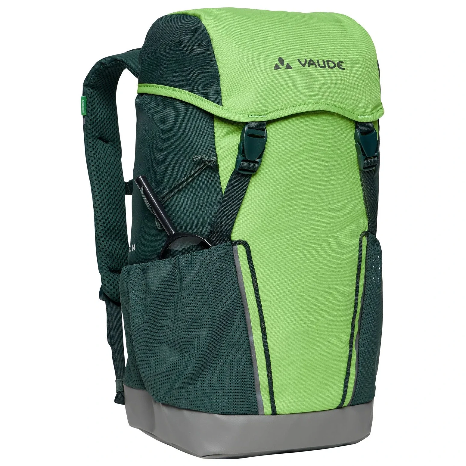 Zaino da trekking per bambini comodo Puck 14 del marchio Vaude è in questa versione ancora più adatto alle esigenze dei bambini. È dotato di una fodera impermeabile, così non dovrete preoccuparvi se i bambini mettono lo zaino in acqua. Il sistema di sospensione e la fascia toracica regolabile garantiscono la massima comodità. Incluso nello zaino c'è anche una tenda da pioggia e una seduta imbottita. Lo zaino è dotato di due ampie tasche esterne in rete, stampa riflettente e una tasca sul coperchio per i piccoli oggetti. I piccoli esploratori saranno felici di sapere che lo zaino Puck 14 ha una lente d'ingrandimento incorporata. Questo zaino è realizzato in materiale riciclato ed è realizzato con Eco Finish, un materiale idrorepellente ecologico senza l'uso di fluorocarburi (PFC).