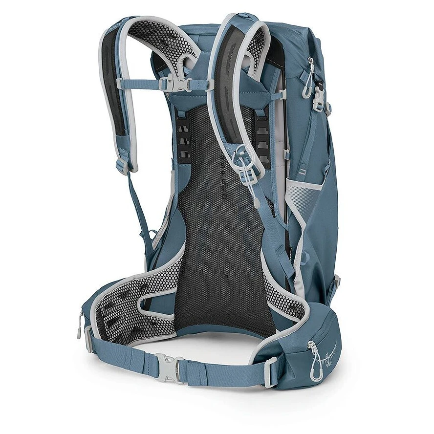 Questo zaino da donna resistente e funzionale combina un sistema di ventilazione dorsale AirSpeed™ eccezionalmente traspirante con una struttura impermeabile dello scomparto principale (IPX5), in modo che la tua attrezzatura rimanga asciutta anche sotto la pioggia battente. Realizzato in nylon riciclato al 100% certificato bluesign®, unisce materiali ecologici all'eccellenza tecnica per cui Osprey è rinomata.