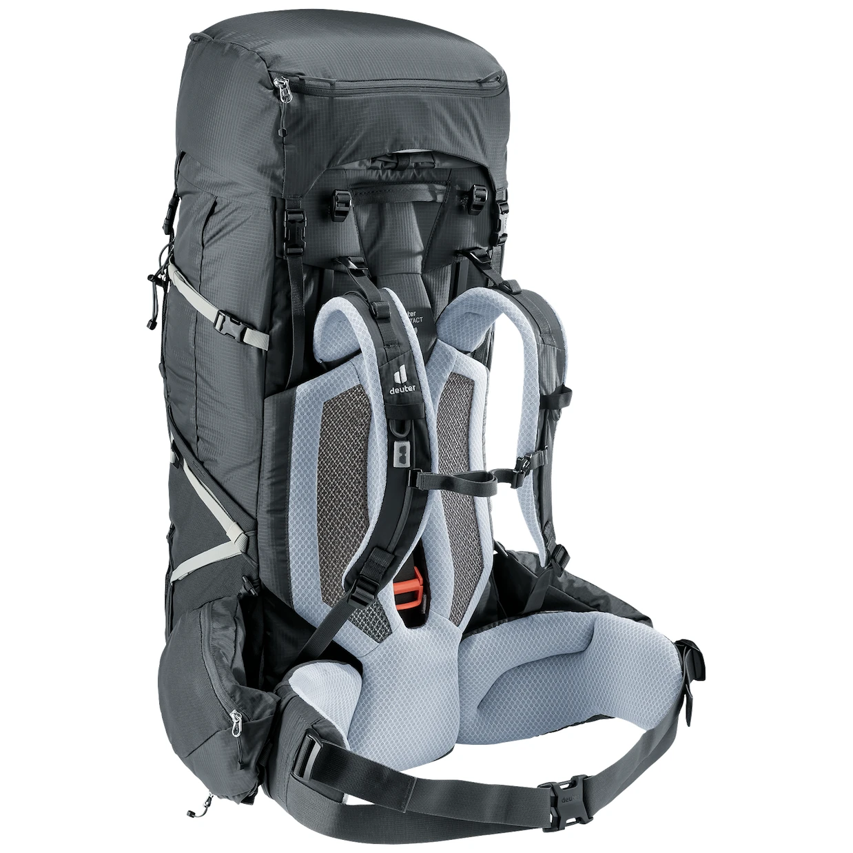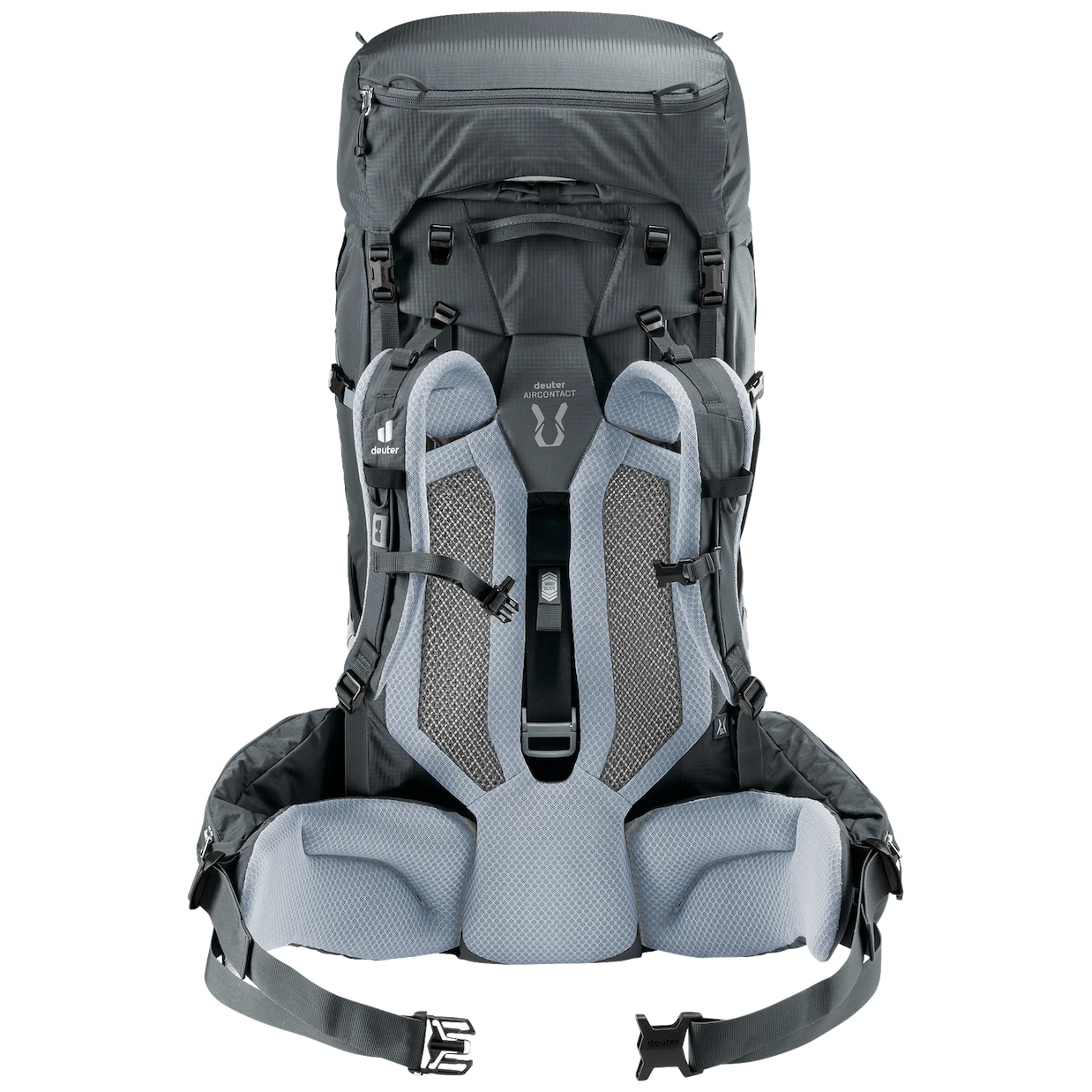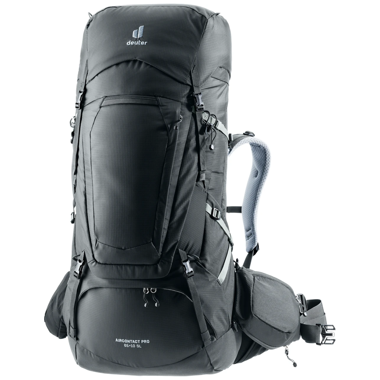 Lo zaino da trekking Aircotact Pro 65+10 SL del marchio Deuter è realizzato in un taglio da donna, con schienale più corto e spalle più strette.