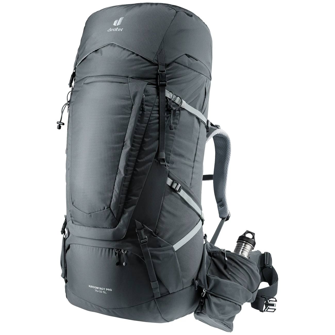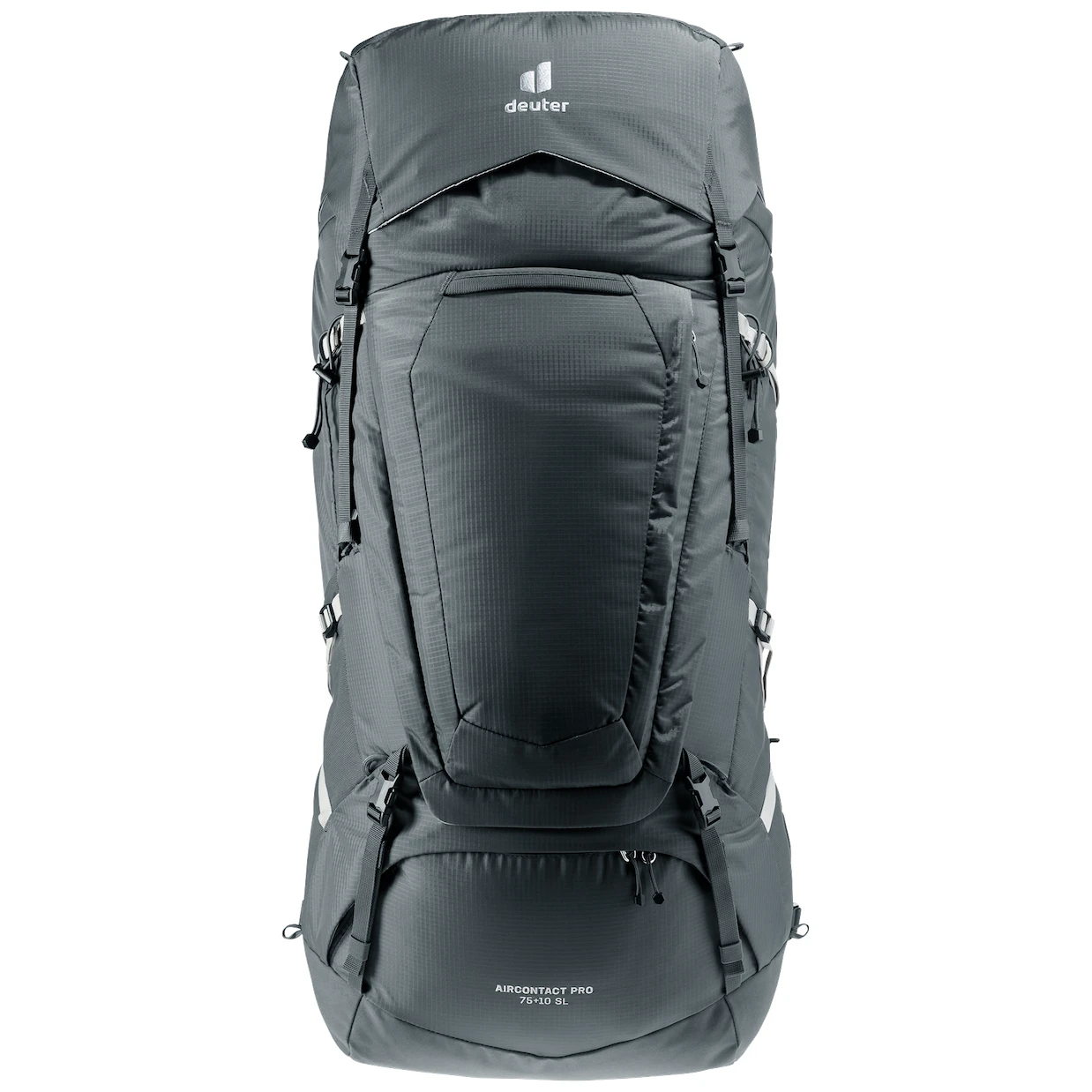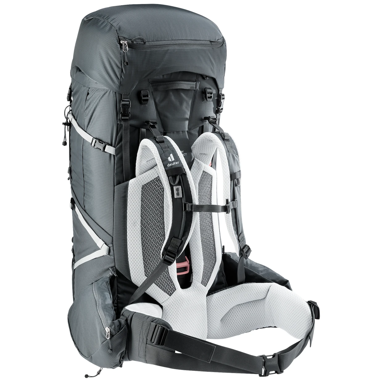 Lo zaino da trekking Aircotact Pro 75+10 SL del marchio Deuter è realizzato in un taglio da donna, con schienale più corto e spalle più strette.