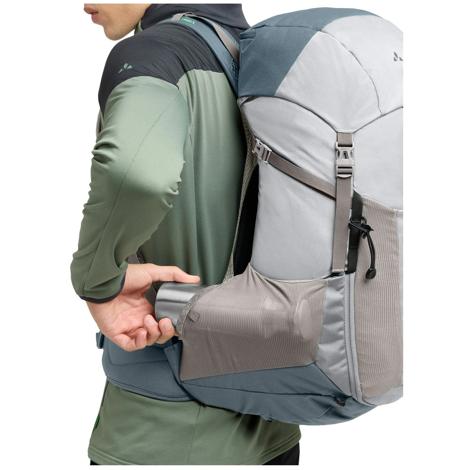 Le alette lombari con tasca con zip garantiscono stabilità e un trasporto sicuro del carico. Il materiale Eco Finish è resistente all'acqua e allo sporco senza PFC ed è realizzato in PET riciclato. Il marchio VAUDE Green Shape garantisce una produzione ecologica e funzionale.