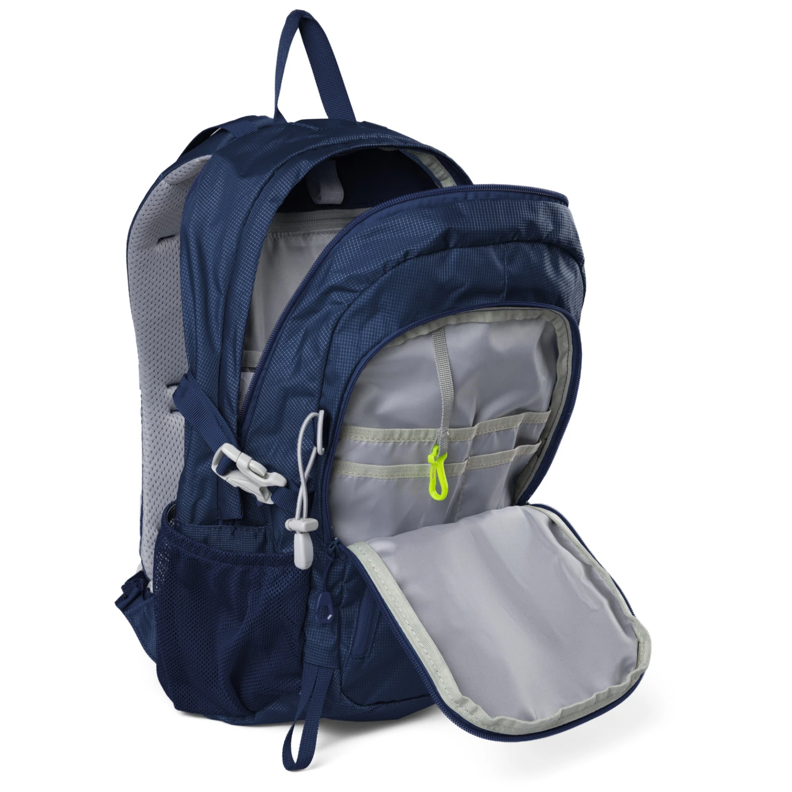 Lo zaino è dotato di un'ampia tasca principale con uno scomparto per l'idrovora e di una tasca frontale con un organizer e un passante per le chiavi. Una piccola tasca frontale per i piccoli oggetti e un passante per i bastoncini da trekking completano l'equipaggiamento.