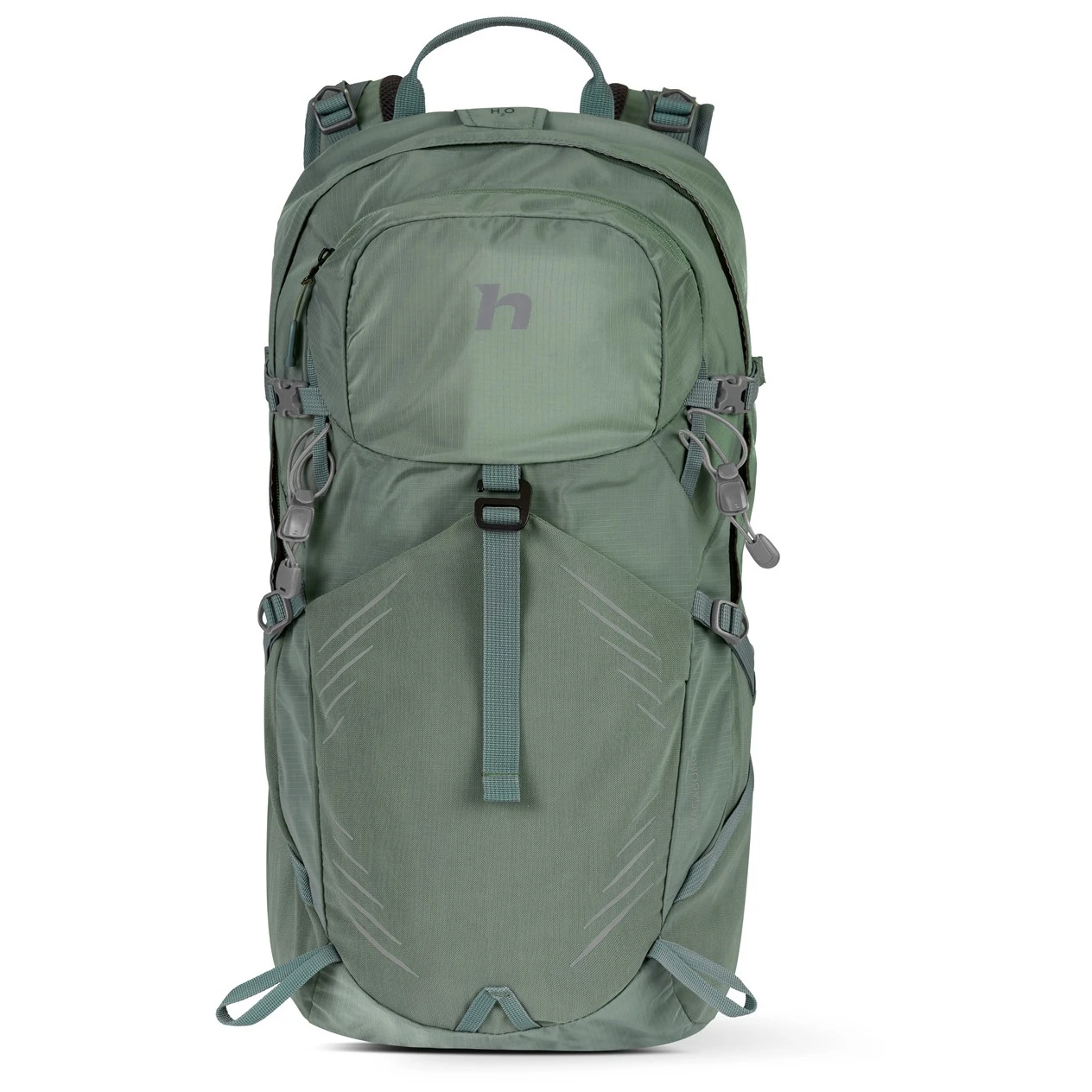 Lo zaino è dotato di una fascia toracica con fischietto per una maggiore sicurezza, di cinghie di compressione laterali per una migliore stabilità del carico e di due maniglie con fori da trekking. Il pratico layout comprende due tasche laterali, una tasca anteriore con cerniera, una tasca anteriore in rete e una tasca con uscita per la sacca dell'acqua. Sono inclusi anche un supporto per paraocchi e una copertura antipioggia integrata con elementi riflettenti per proteggersi dal maltempo.
