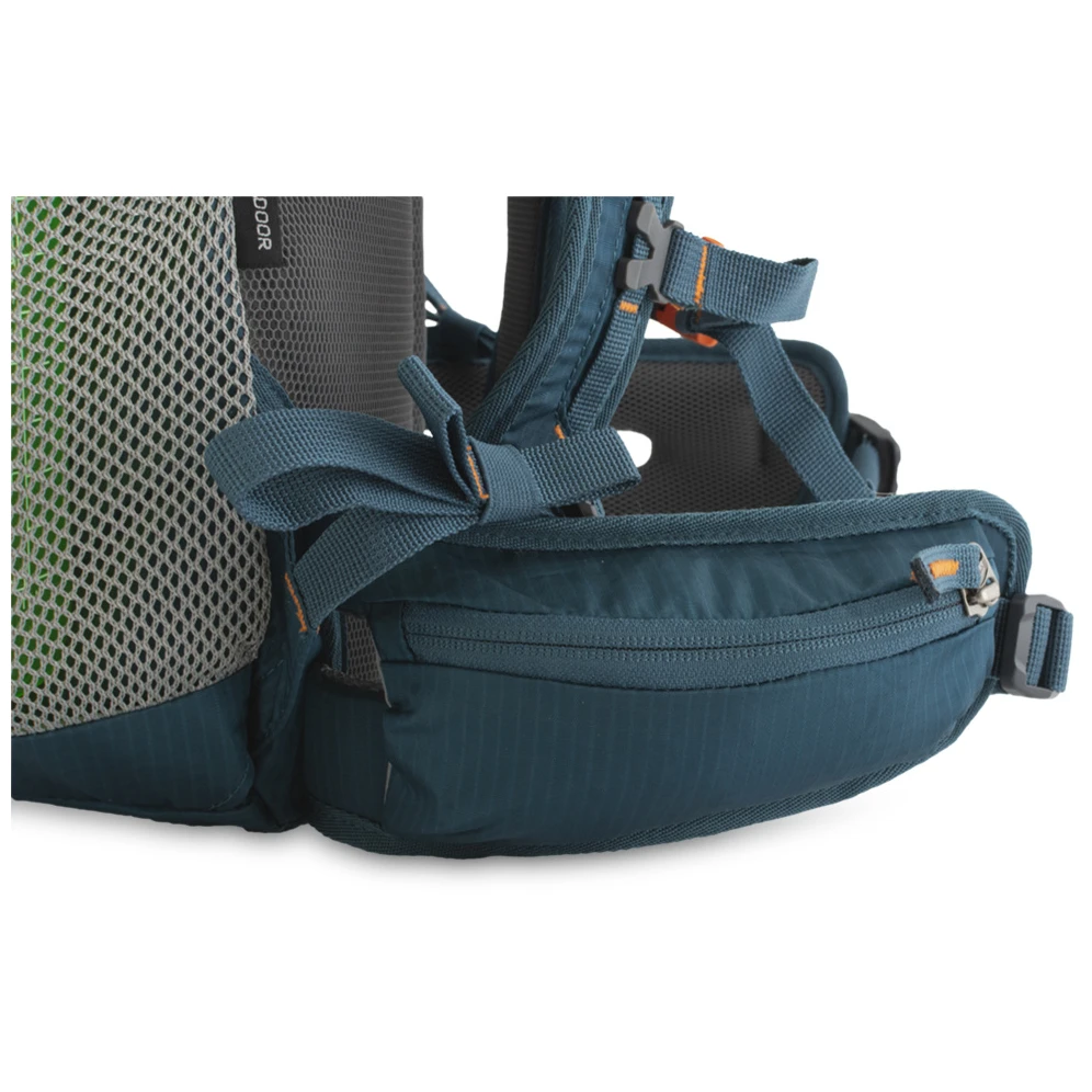 Gli spallacci hanno un'imbottitura rinforzata nella zona delle spalle. Per un comfort ancora maggiore durante il trasporto di carichi pesanti, sono perforati nella parte superiore per una maggiore traspirabilità. Grazie alla leggera cintura in vita, si adatta perfettamente ai fianchi. Le spaziose tasche laterali possono contenere bottiglie da 1 litro. Un paio di catene verticali sulla parte anteriore dello zaino servono a fissare l'equipaggiamento supplementare.