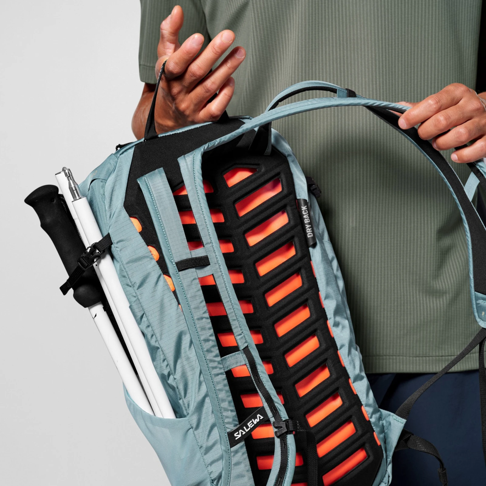 Il sistema dorsale in rete crea uno spazio tra la schiena e lo zaino. L’aria può circolare liberamente, migliorando la ventilazione della schiena e accelerando l’evaporazione del sudore. Lo svantaggio è una leggera riduzione del volume interno e un centro di gravità meno stabile.