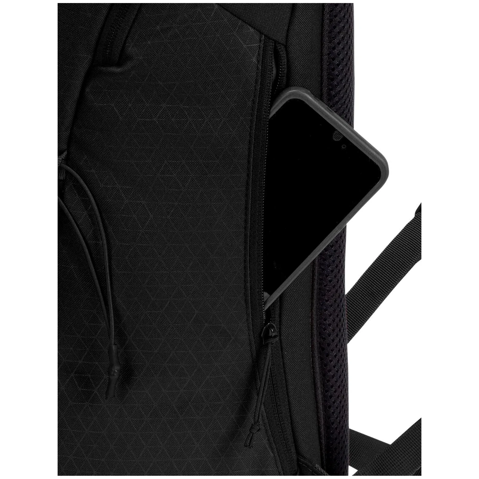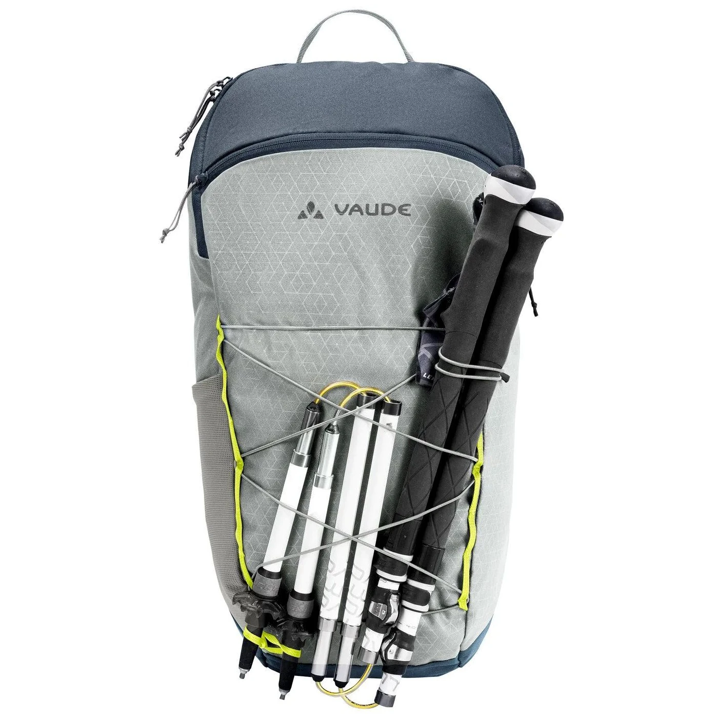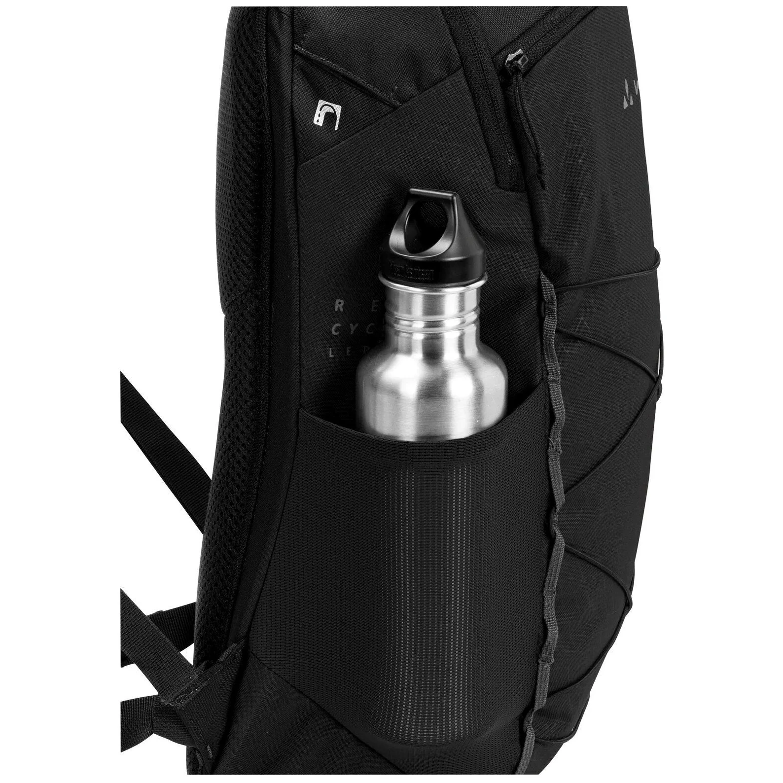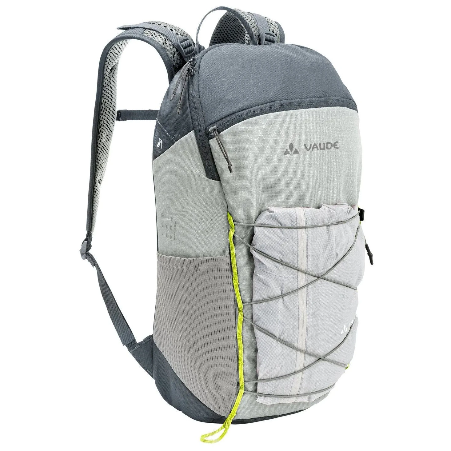 Lo scomparto principale può contenere una mantellina antipioggia, uno snack, acqua e piccoli oggetti, la tasca laterale con zip consente un rapido accesso al telefono o alle chiavi e il cordino elastico anteriore serve per fissare il casco o la giacca. Lo zaino è realizzato in poliestere riciclato al 100% e dotato di un rivestimento Eco Finish senza PFC che respinge l'acqua e lo sporco. La certificazione VAUDE Green Shape e bluesign® conferma la produzione ecologica e rispettosa dell'ambiente.